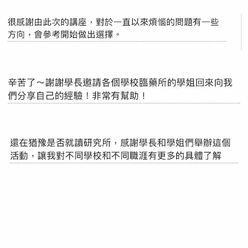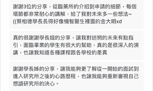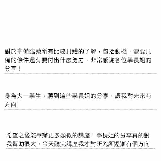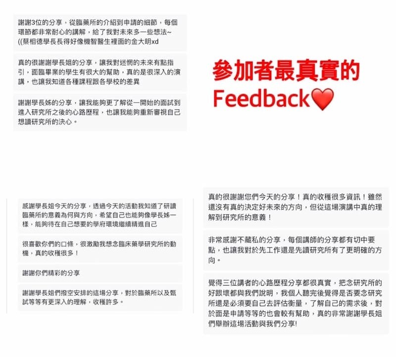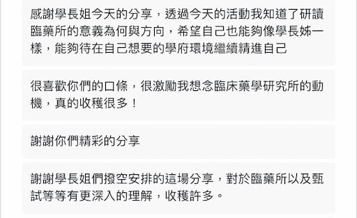 畢業後飲水思源,期望透過分享當時準備方法、學長姐指導、臨藥所兩年經歷,提供學弟妹
